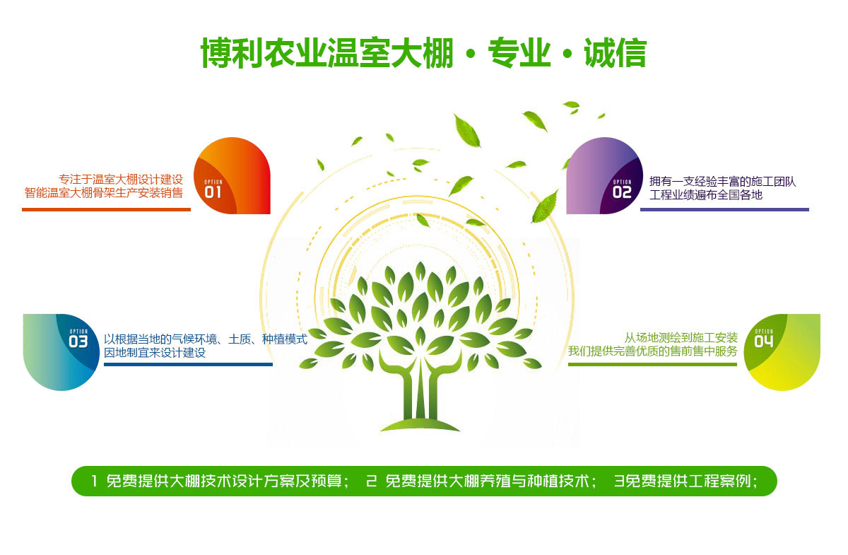 安陽博利農業科技有限公司,是一家專業生產溫室大棚的現代化企業。公司擁有大棚材料生產線,各種加工折彎,縮頭等設備,及專業研發、技術人員,提供設計、制作、安裝及售后全程服務。公司在鍍塑鋼管大棚,幾字鋼、C型鋼溫室大棚,薄膜連體大棚,玻璃智能連棟大棚,反季節蔬菜溫室大棚,花卉大棚…